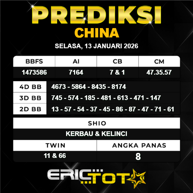 Hallo para togel mania kembali lagi bersama kami di Prediksi Erictoto. Kali ini saya akan membagikan angka Prediksi China hari ini dengan seakurat mungkin. Kami para Perumus angka akan memprediksi Angka China hari ini, Tidak sembarang rumus yang kami racik tetapi ini hasil kolaborasi dari para master angka tentunya.