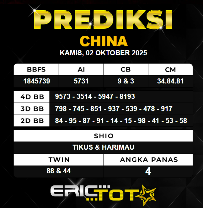 Hallo para togel mania kembali lagi bersama kami di Prediksi Erictoto. Kali ini saya akan membagikan angka Prediksi China hari ini dengan seakurat mungkin. Kami para Perumus angka akan memprediksi Angka China hari ini, Tidak sembarang rumus yang kami racik tetapi ini hasil kolaborasi dari para master angka tentunya.