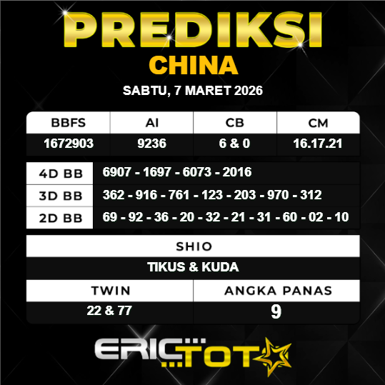 Hallo para togel mania kembali lagi bersama kami di Prediksi Erictoto. Kali ini saya akan membagikan angka Prediksi China hari ini dengan seakurat mungkin. Kami para Perumus angka akan memprediksi Angka China hari ini, Tidak sembarang rumus yang kami racik tetapi ini hasil kolaborasi dari para master angka tentunya.
