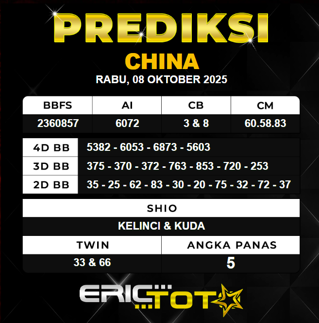 Hallo para togel mania kembali lagi bersama kami di Prediksi Erictoto. Kali ini saya akan membagikan angka Prediksi China hari ini dengan seakurat mungkin. Kami para Perumus angka akan memprediksi Angka China hari ini, Tidak sembarang rumus yang kami racik tetapi ini hasil kolaborasi dari para master angka tentunya.