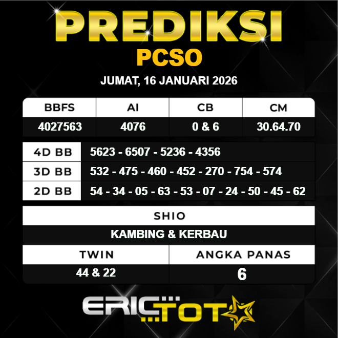 Hallo para togel mania kembali lagi bersama kami di Prediksi Erictoto. Kali ini saya akan membagikan angka Prediksi PCSO hari ini dengan seakurat mungkin. Kami para Perumus angka akan memprediksi angka PCSO hari ini, Tidak sembarang rumus yang kami racik tetapi ini hasil kolaborasi dari para master angka tentunya.