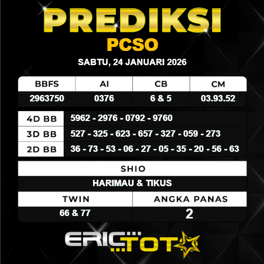 Hallo para togel mania kembali lagi bersama kami di Prediksi Erictoto. Kali ini saya akan membagikan angka Prediksi PCSO hari ini dengan seakurat mungkin. Kami para Perumus angka akan memprediksi angka PCSO hari ini, Tidak sembarang rumus yang kami racik tetapi ini hasil kolaborasi dari para master angka tentunya.