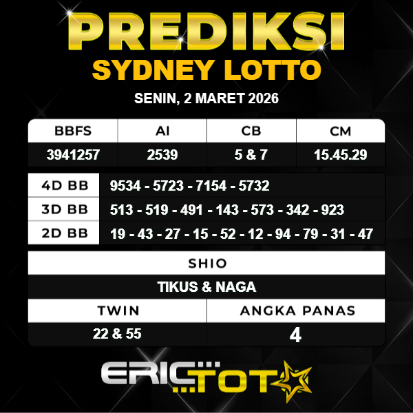 Hallo para togel mania kembali lagi bersama kami di Prediksi Erictoto. Kali ini saya akan membagikan angka Prediksi Sydney hari ini dengan seakurat mungkin. Kami para Perumus angka akan memprediksi angka Sydney hari ini, Tidak sembarang rumus yang kami racik tetapi ini hasil kolaborasi dari para master angka tentunya.