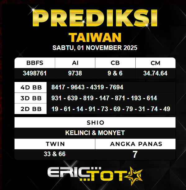 Hallo para togel mania kembali lagi bersama kami di Prediksi Erictoto. Kali ini saya akan membagikan angka PREDIKSI TAIWAN hari ini dengan seakurat mungkin. Kami para Perumus angka akan memprediksi Angka Taiwan hari ini, Tidak sembarang rumus yang kami racik tetapi ini hasil kolaborasi dari para master angka tentunya.