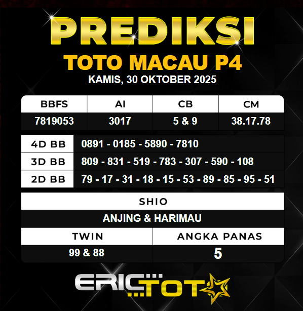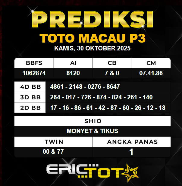 Hallo para togel mania kembali lagi bersama kami di Prediksi Erictoto. Kali ini saya akan membagikan angka Prediksi Macau hari ini dengan seakurat mungkin. Kami para Perumus angka akan memprerdiksi angka macau hari ini, Tidak sembarang rumus yang kami racik tetapi ini hasil kolaborasi dari para master angka tentunya.